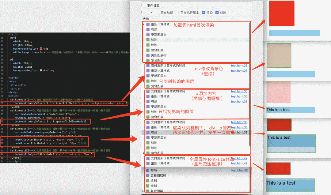 - 全局范围重排、局部范围重排、重绘的影响范围示例