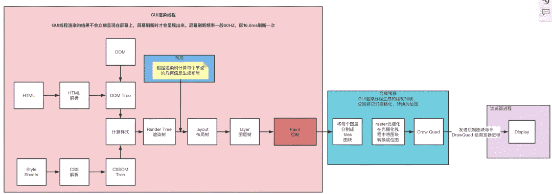 渲染绘制 (Paint)。根据计算好的绘制列表信息绘制整个页面,并将其提交到合成线程