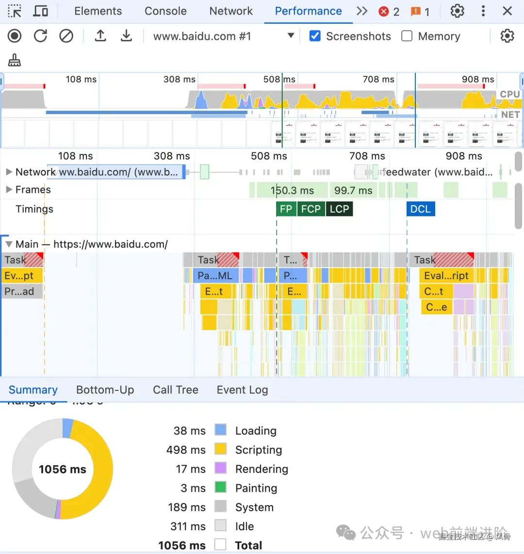 除了上述通过代码进行度量性能外,还可以在 浏览器控制台 - Performance 选项卡 中查看和分析页面性能。其中包含 FCP 性能指标、页面内容绘制 的耗时统计 等。