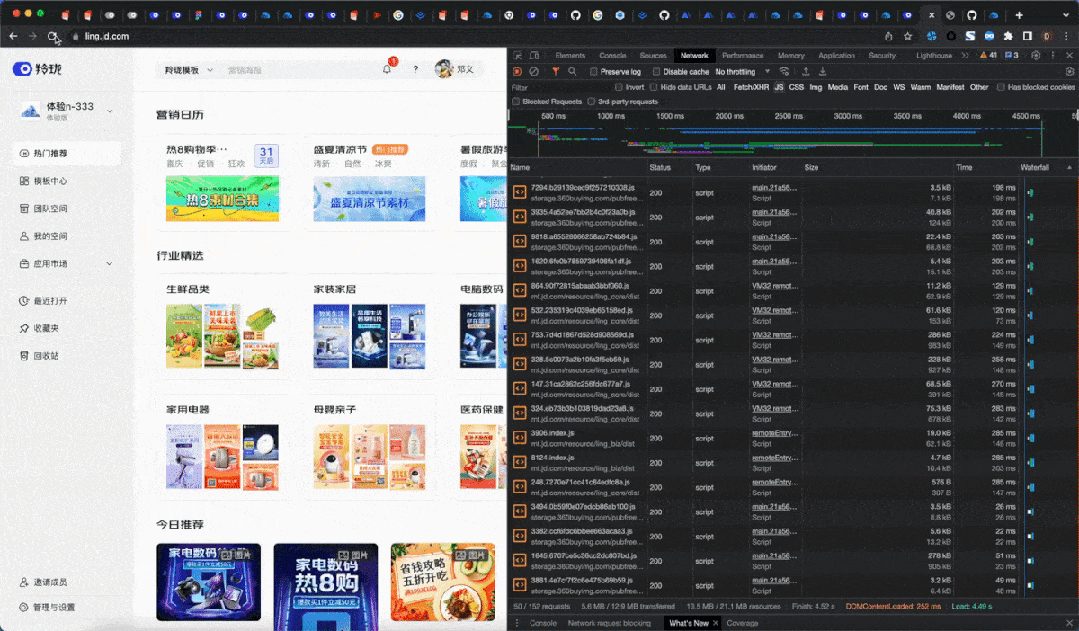 点击按钮后,拉取对应的拆包资源及远程 module federation 组件资源,请求完成后渲染组件,存在体验卡顿,如下图:有预加载时:hover 到某个区域 / 某个组件渲染时 (开发者自定义) 即可触发资源预加载,