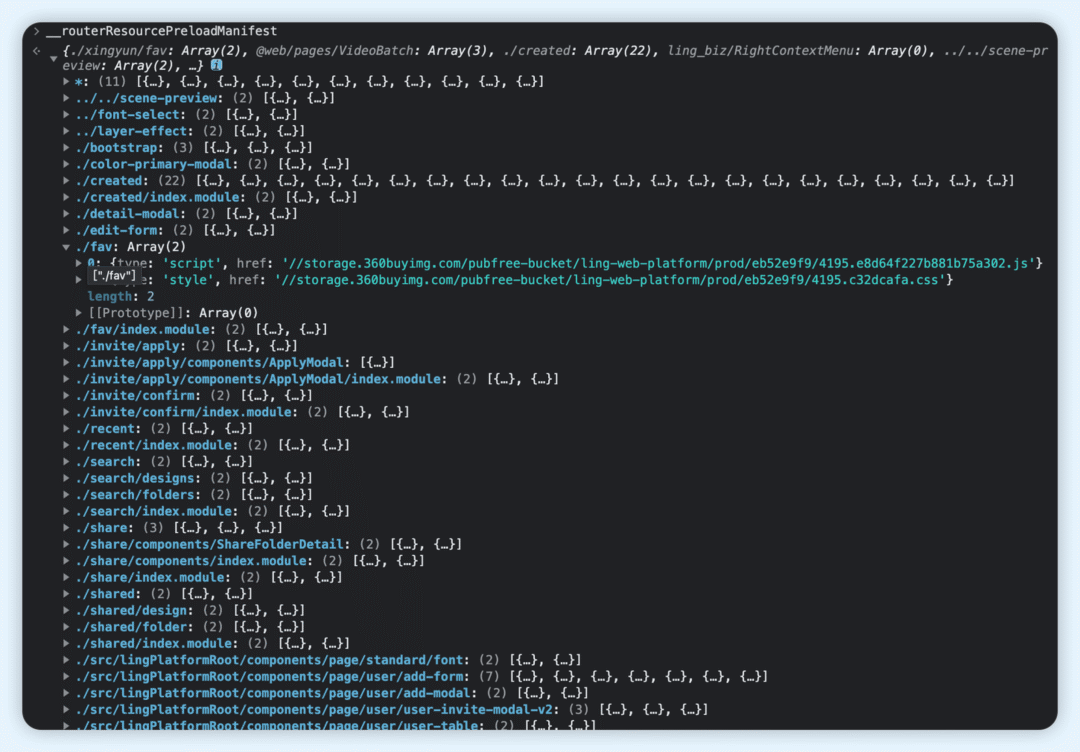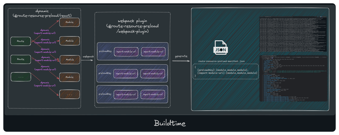 构建时 通过 dynamic[8] API 及 webpack plugin[9] 对模块进行拆包的同时,还会将preloadKey(开发者自定义的预加载标识)、import-module-url(import 模块路径)、chunk(output产物)三者之间的关系以json形式进行保存,并允许应用端访问。