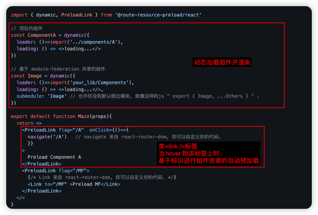 Any code can be split: 通过以上的预加载机制,实现应用内 Any code can be split(一切代码都可以被拆包),且能保证不影响用户体验,让开发者没有了因为单页面资源过大影响应用性能的烦恼,SPA(单页面应用) 也可以拥有极致的首屏幕加载体验和交互体验,🐟 与 🐻 掌兼得。module federation(模块联邦) 组件预加载: 对于 webpack 的 module federation(模块联邦) 而言,由于 module federation 打包出来的资源默认采用了按需动态加载的方案,因此当我们渲染一个比较大的 module federation 组件时,也会存在体验卡顿的情况,这时对该 module federation 组件进行预加载便可解决该体验问题。革新开发者对组件懒加载的了解,减少开发者心智负担:开发者可以简单粗暴地基于页面维度对某个路由渲染的组件进行懒加载,不再需要担心懒加载的资源过大以至于加载时间过长影响页面渲染时间,避免开发者需要从组件维度去分析哪些组件需要使用懒加载,直接路由懒加载"一把梭哈"。