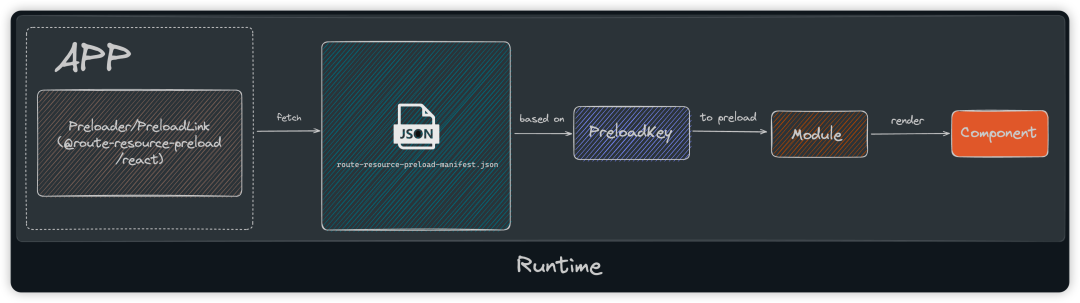 运行时流程图:运行时 则是基于构建出的json, 开发者通过设置Preloader 或者是<PreloadLink>的preloadKey,对应的相关资源将被预加载,并基于 dynamic[10] API 渲染组件。
