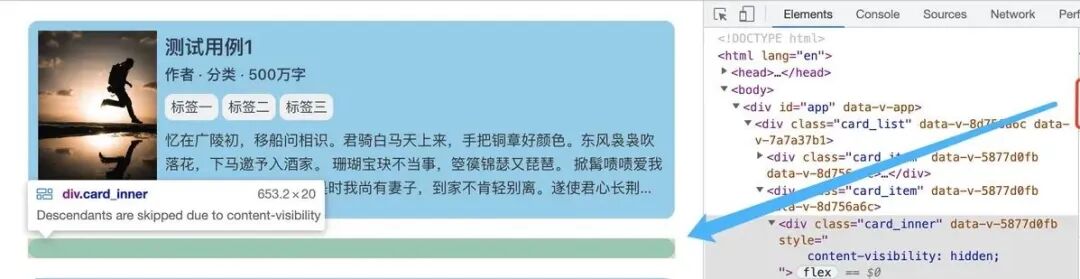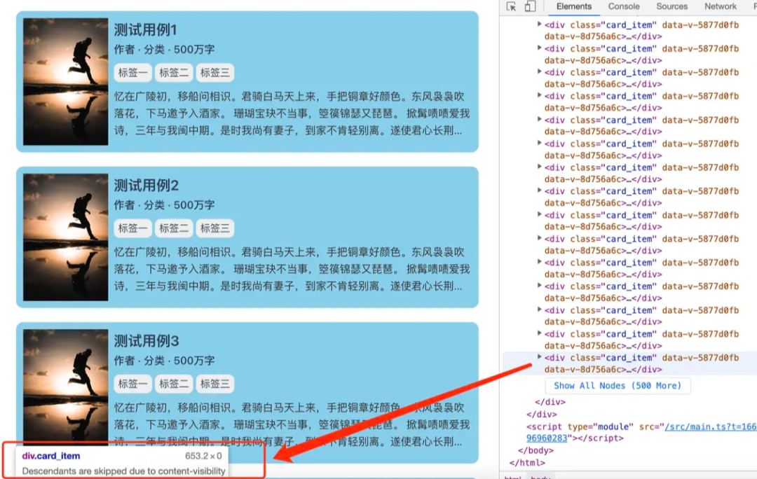 此时就可以直接使用 content-visibility: auto 它可以用来跳过屏幕外的内容渲染,对于这种有大量离屏内容的长列表,可以大大减少页面渲染时间。