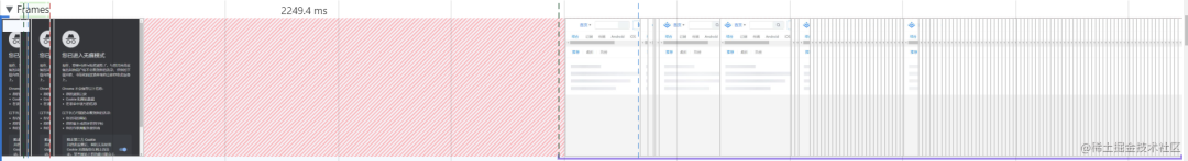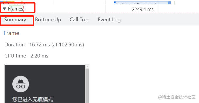 通过 Frames 指标可以查看页面每一帧渲染时 CPU 所消耗的时间和持续时间 Duration 的信息,如下: