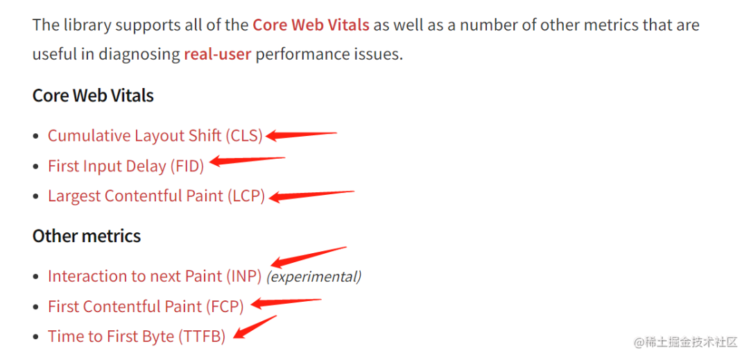 web-vitals[4] 库是 Google 推出的一个小型(约 1.5K)模块化库,用于测量真实用户的所有 Web Vitals 相关的指标,其重要核心指标信息如下(一图胜千言):