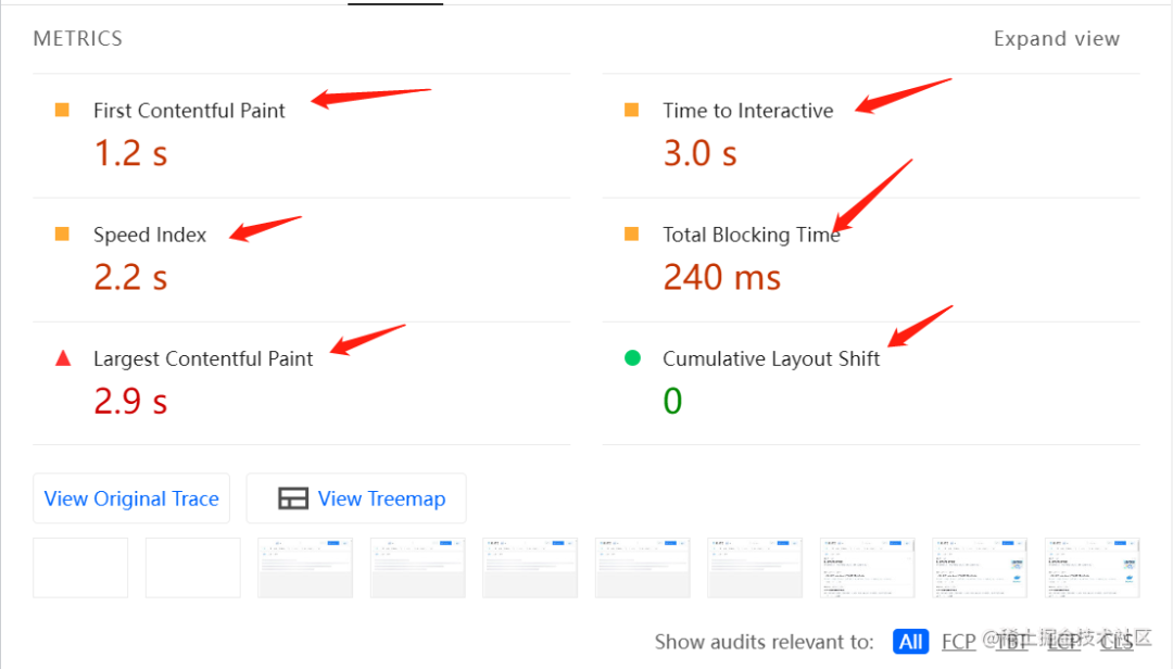 从性能指标的数据来看,只有 累积布局偏移(Cumulative Layout Shift, CLS) 满足要求,其他指标显示 黄色 和 红色,意味着仍有改进的空间,特别是 首屏时间 是 2.9s 已经是超过了对应的阈值 2.5s。
