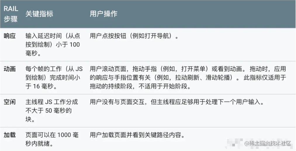 Google 为前端页面性能的评估提出了 RAIL 模型,核心内容如下: