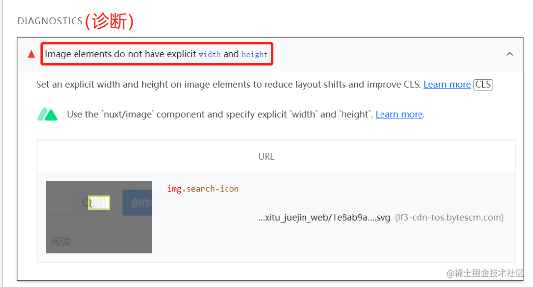 甚至还提供了对应的诊断结果,比如提到的图片没有设置对应的宽高: