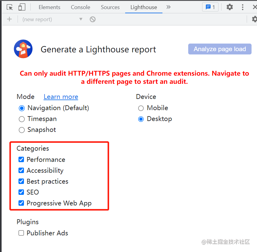可以通过 Analyze page load 按钮来开始对页面应用进行检测,这里以掘金首页为例:
