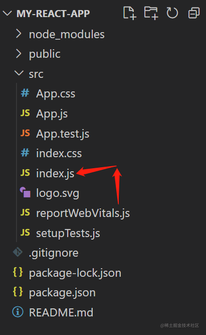 接下来,让我们通过 npx create-react-app my-react-app 来创建一个 react 项目,然后观察一下它的项目结构: