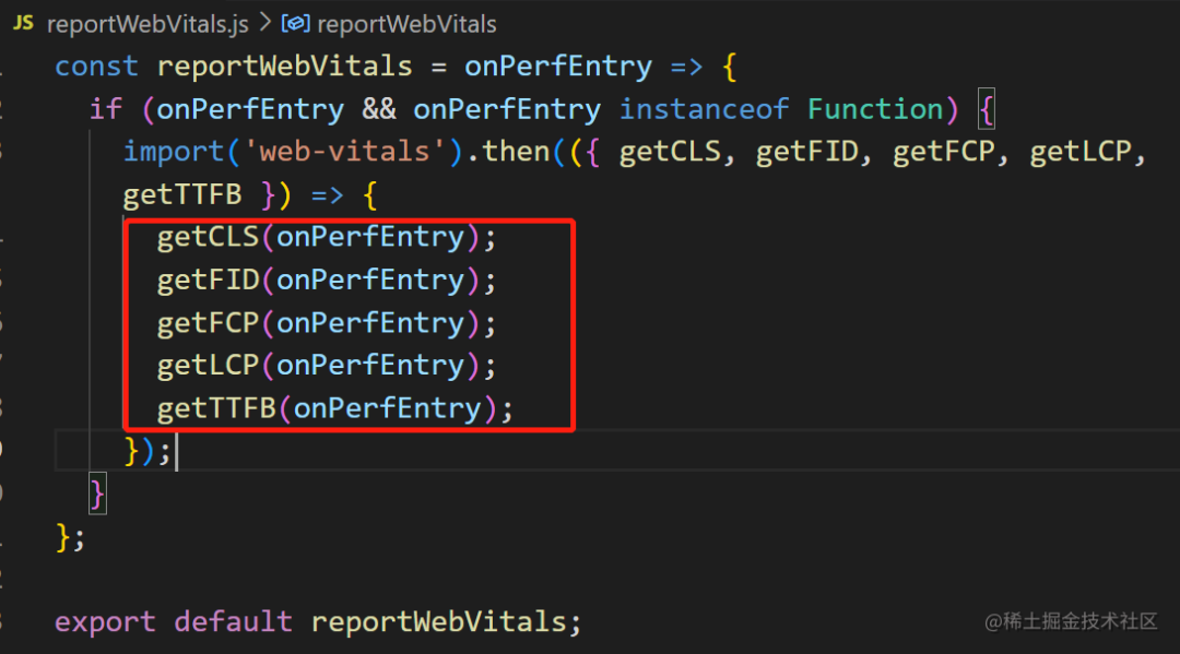 是不是超级显眼的 reportWebVitals.js,在进入文件查看你会发现我们需要的核心性能指标都在里面: