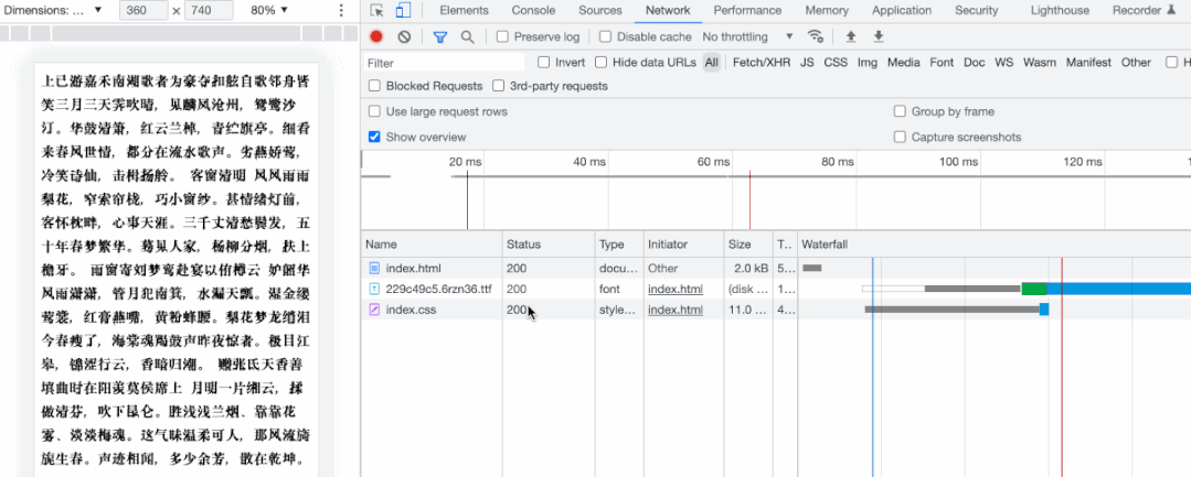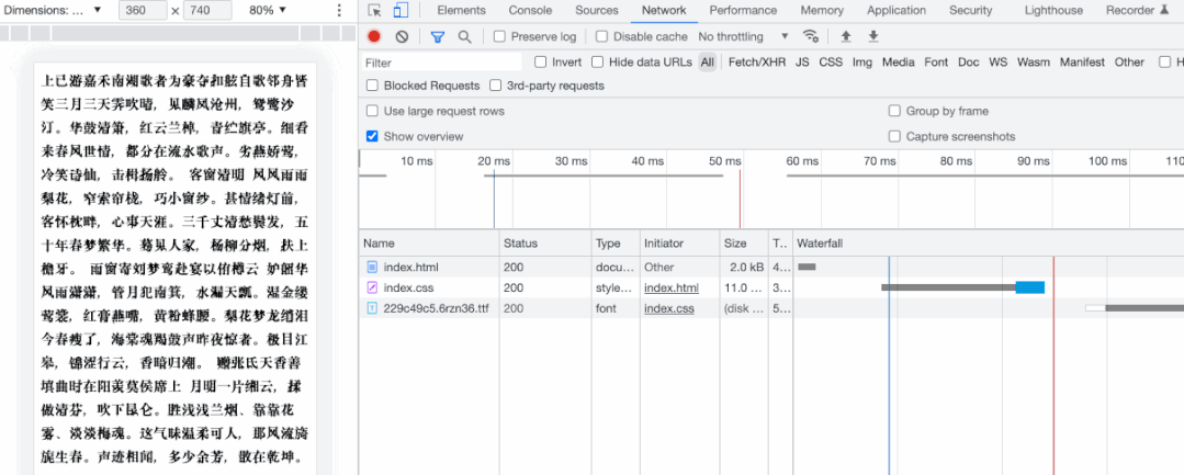 <link rel="preload" as="font" crossorigin href="https://xxx/229c49c5.6rzn36.ttf">再次刷新页面,我们可以看到页面没有出现文字样式闪动了,并且我们在 network 面板中可以看到字体文件的加载时机提前了,在浏览器请求 html 后很快就开始加载字体文件了。