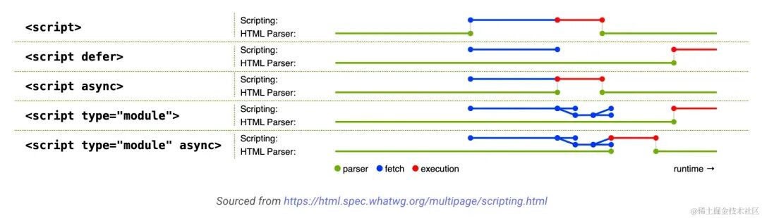 async 和defer 允许外部脚本在加载时不阻塞 HTML 解析器,而带有type="module" 的脚本(包括内联脚本)会自动被延迟执行。