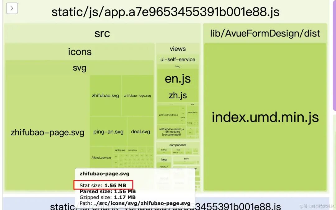 在用 webpack-bundle-analyzer 查看包大小的时候,发现一个 SVG 竟然有 1.5M!你敢信?而且 SVG 不会经过打包有大小变化,就是即使经过 Webpack 打包,Gzip 压缩,他也会占用 1.5M 的的大小,优化前也才 5.9M,所以 1.5M 占比很大需要优化。