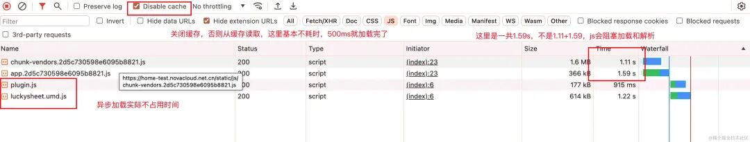 注意优化后的时间 chunk-vendors.js 和 app.js 加载一共耗时 1.59s,不是 1.11+1.59,chunk-vendors 的下载解析会阻塞 app.js 的下载解析,所以一共 1.59s。