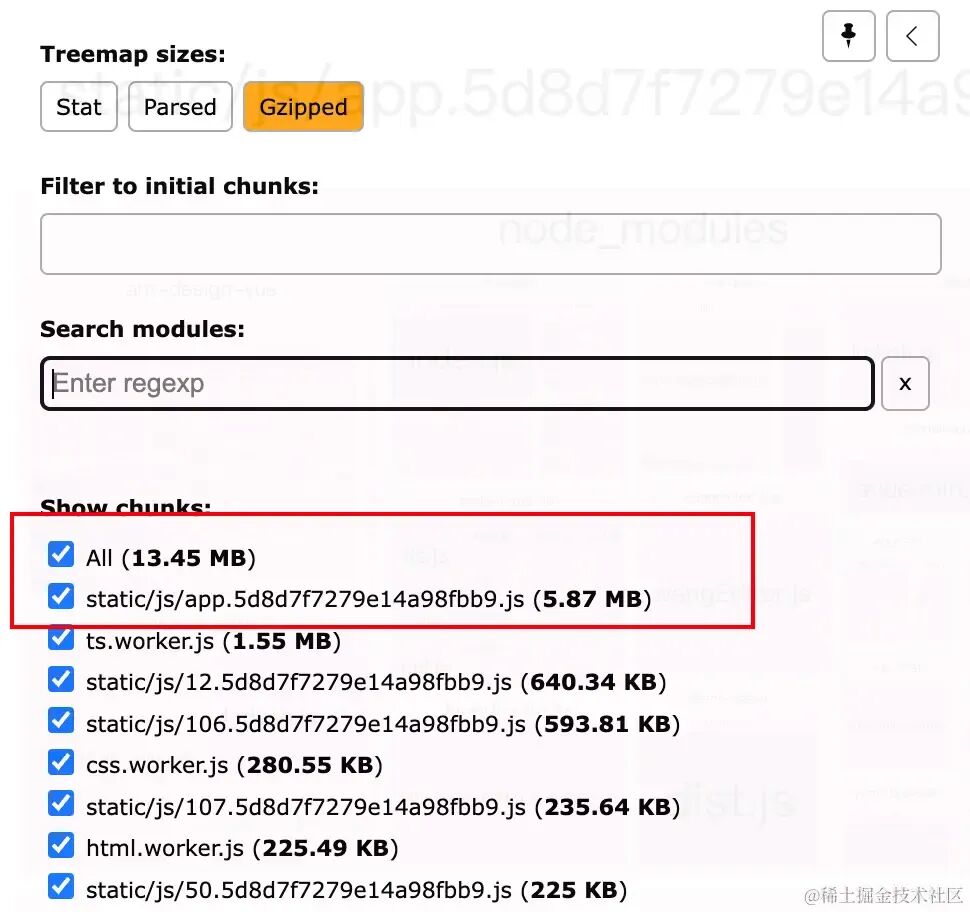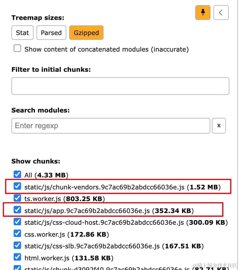 Stat: 源代码阶段 Parsed: 经过 webpack 打包后的大小 Gzipped: 经过 Gzip 压缩过后的大小,实际浏览器接收的大小,需要服务器开启 Gzip 压缩 这里的大小主要关注 chunk-vendors.js 和 app.js。其他都跟首页加载关系不大。下面的首屏代码大小是这两个 js 代码大小之和。 chunk-vendors 是引用的第三方库如 element-ui、echarts、vue 等等打包后的代码。app.js 是项目的代码。