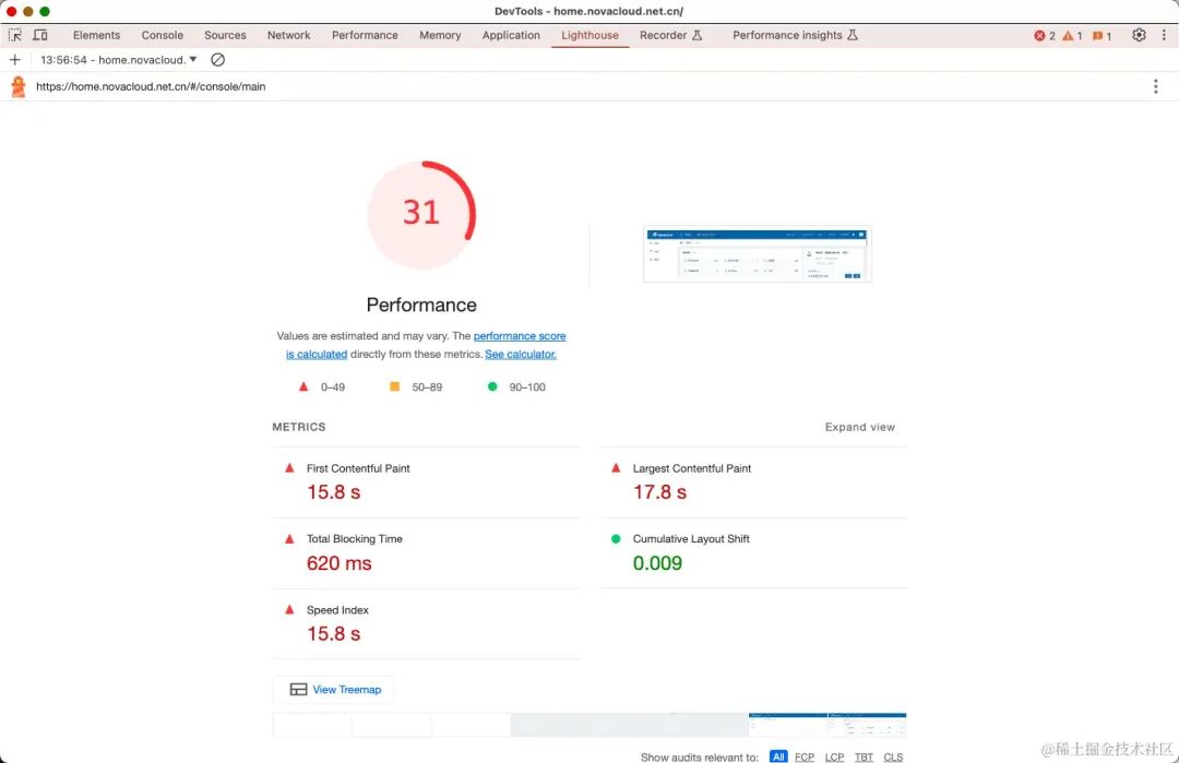 LightHouse 性能指标解释: FCP:衡量的是打开网页后,浏览器渲染第一段 DOM 内容所用的时间 LCP:用于测量视口中最大的内容元素何时渲染到屏幕上。这粗略地估算出网页主要内容何时对用户可见。 因为要优化的页面没有像官网那样有轮播图占据大量显示位置的元素,所以我主要关注 FCP,FCP 解决 LCP 也会相应变快