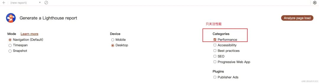 这里只关注性能所以只勾选了 Performance 指标,其他可访问性、SEO 有需求一同检测的自行勾选上。
