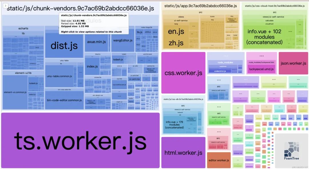 // webpack.config.js配置文件const BundleAnalyzerPlugin = require('webpack-bundle-analyzer').BundleAnalyzerPlugin; module.exports = { // ... 其他配置 ... plugins: [ new BundleAnalyzerPlugin() ] };- 这样在打包的时候会生成一个静态网站查看各个模块占用的存储空间大小