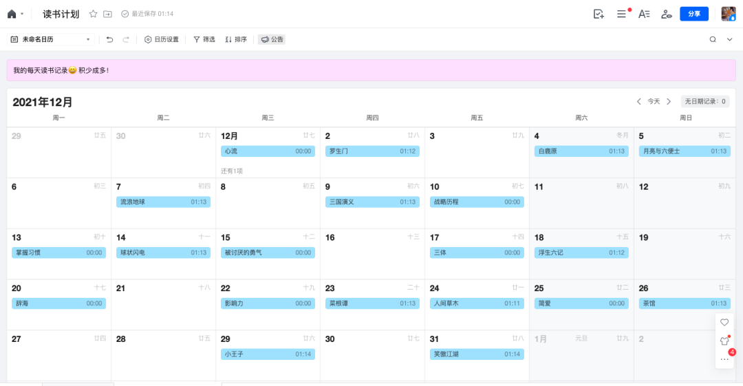 它本质上是一个在线数据库,一份数据多种维度展示,目前已经有表格视图、看板视图、画册视图、甘特视图、日历视图等。