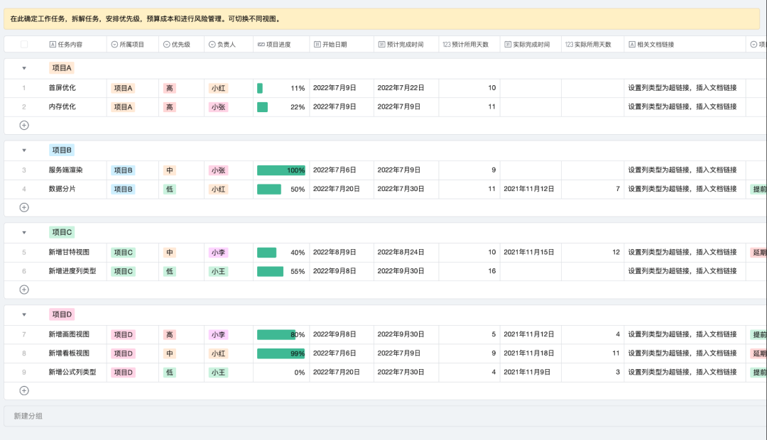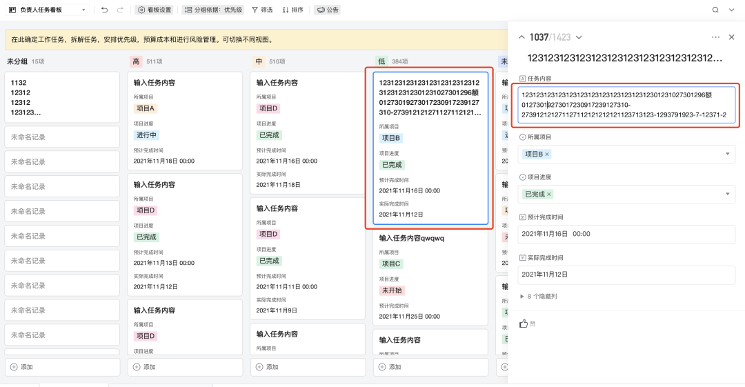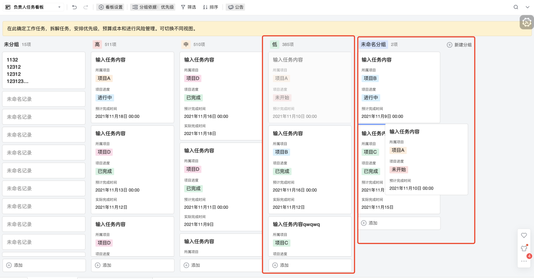 看板视图可以根据单选列作为分组依据,进行卡片的一个聚合分组展示,而且卡片的高度是不固定的,只有当前列有内容才会展示出来。