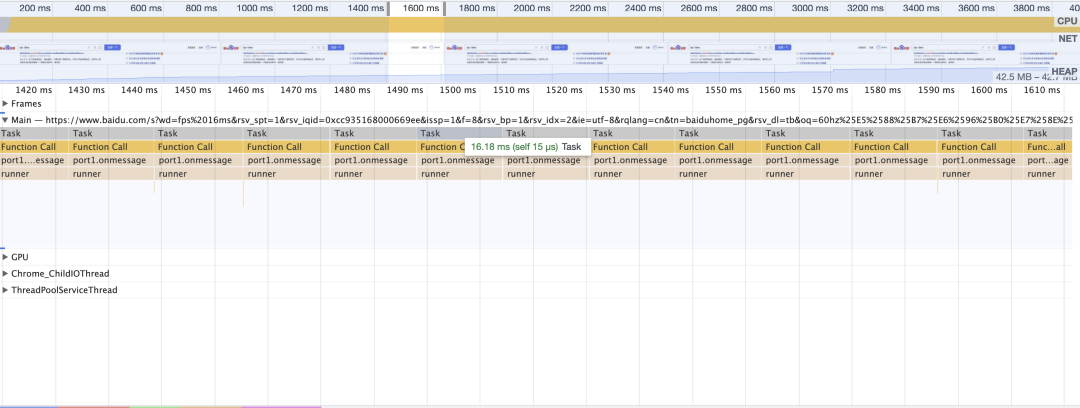 但从火焰图上可以看到当前每个 Task 都保持在 16ms 左右的耗时,FPS 基本稳定在 60 左右。