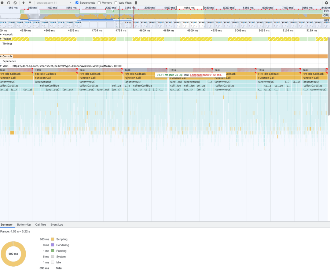 几个月前对腾讯文档 Smart Sheet 中看板视图的排版计算进行了一次优化,主要是利用异步分片计算来提高当前的 FPS 值,避免用户操作被阻塞。感谢 kylehr 的支持和帮助。