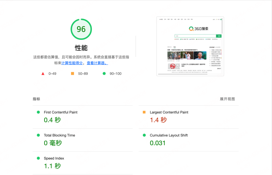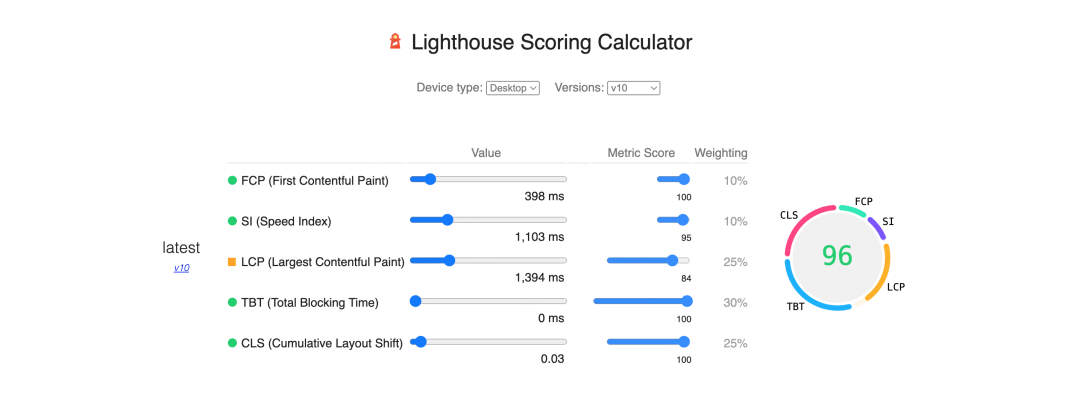 页面中包含了性能的指标、数据 (value)、得分(Metric Score) 以及权重(Weighting),而最终的性能得分就是这些指标分数的加权平均值。即(从上往下开始计算):(100*0.1 + 95*0.1 + 84*0.25 + 100 * 0.3 + 100 * 0.25) / (0.1+ 0.1+ 0.25+0.3+0.25) 约等于 96(四舍五入)。
