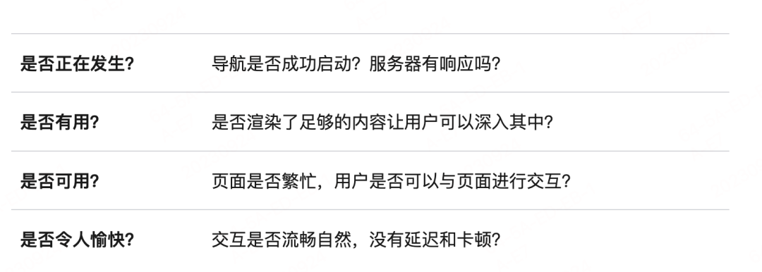 为了能更准确地测量用户的网页性能体验,Chrome团队成员与W3C Web性能工作组共同合作,围绕几个关键问题构建出了指标的框架:可以根据这几个点去对指标进行定义,这些都是跟用户息息相关的。