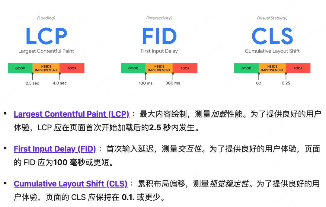 核心Web指标的构成会随着时间的推移而发展 。当前针对2020年的指标构成侧重于用户体验的三个方面——加载性能、交互性和视觉稳定性——并包括以下指标(及各指标相应的阈值):