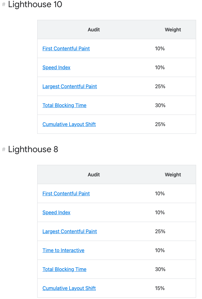 下图为 Lighthouse 10 和 Lighthouse 8的指标及权重变化对比: