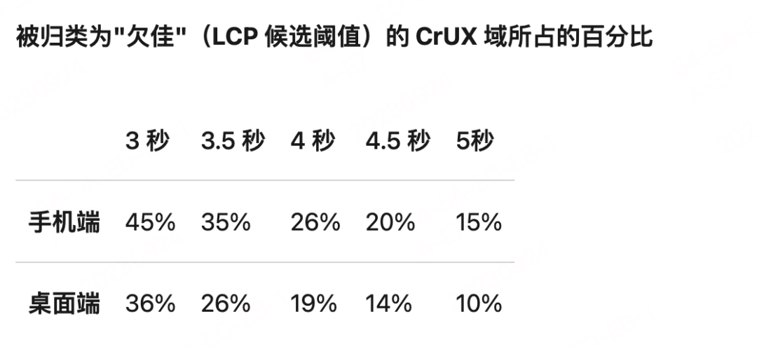 在阈值为4秒的情况下,大约26%的手机端域和19%的桌面端域将被归类为欠佳。这些百分比落在10-30%的目标范围内,因此,4秒是可接受的 "欠佳" 阈值。