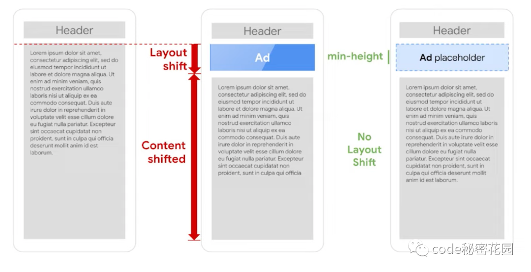 另外还可以将渲染的文字设置适当的高度,例如使用 min-height 来为广告卡片等动态的内容保留最小空间,空元素的默认高度为零像素,所以即使对于某些动态的内容,我们不能确定实际的高度,也是可以通过使用 min-height 来减少 CLS 的影响。