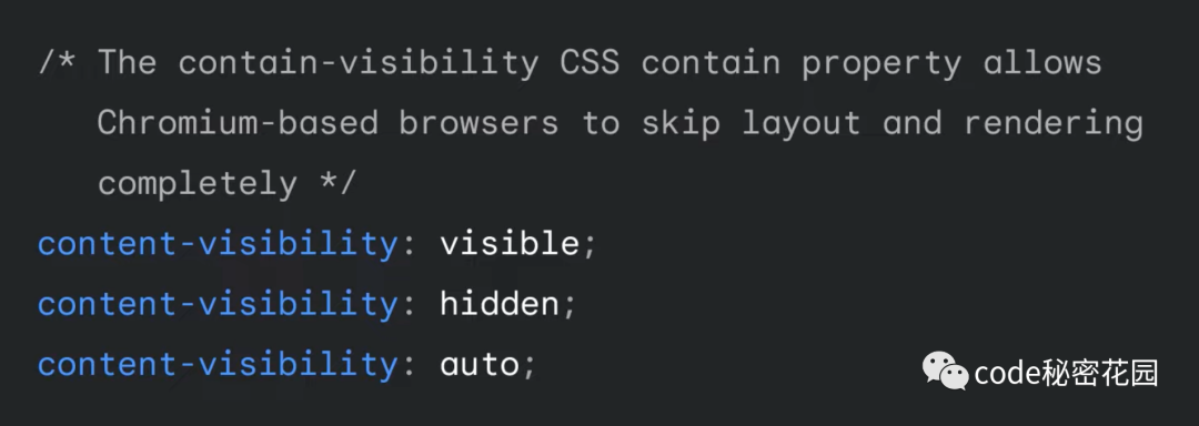 我们还有一个 Lighthouse 审计工具来帮助大家实现这一目标。CSS containment 是另一种分离网页区域的方法,它可以告诉浏览器某些区域中的元素可以不受其他区域更改的影响,从而减少布局的工作。content-visibility 是 CSS containment 的一种扩展能力,允许我们能完全跳过离屏内容的布局和渲染。