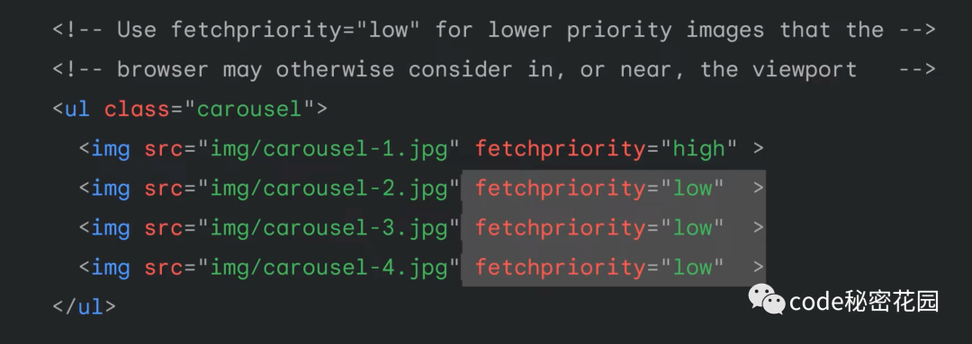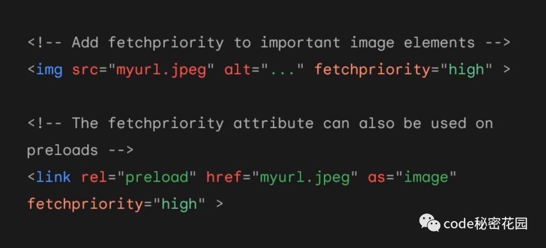 新的 fetch proirity API 允许我们自定义标记资源的优先级。只需将 fetchprority 属性添加到我们的图像或预加载 LCP 元素中,就可以使浏览器更早地开始下载它们,并具有更高的优先级,这可以对 LCP 时间产生很大的影响。这个 API 已经在基于 chromium 的浏览器中提供,Safari 和 Firefox 也正在实现相关代码,并且这个属性是渐进式的,在不支持它的其他浏览器中会被简单地忽略。