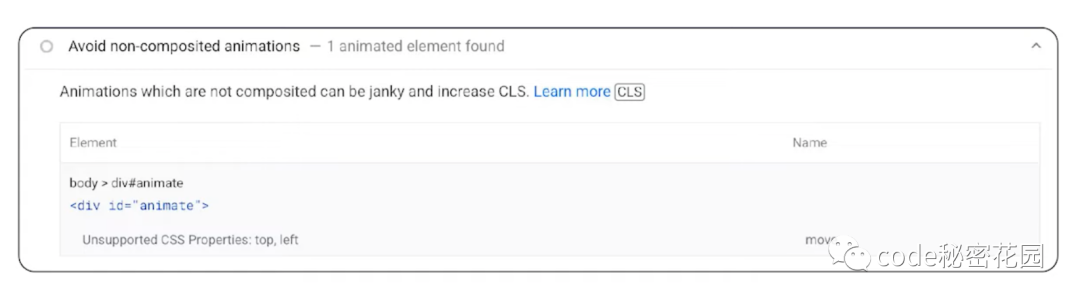 动画的渲染需要浏览器重新布局页面,因此需要更多的工作,即使脱离正常文档流的绝对定位元素,例如使用 top 或 left 移动内容,也会将其计算为布局移位,即使它不会移动任何周围其他的内容,内容本身也在移动,并且有可能影响其他内容,所以这也会影响 CLS。