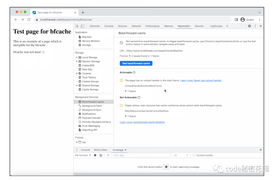一个页面可能在初始加载时具有很大的 CLS ,因为随着其他内容(如图像和广告)的加载,页面的结构会一直产生变化,从而影响 CLS。当然,我们应该尽量在首屏页面渲染时避免加载这些内容。BF 缓存会在用户离开之后,在内存中存储一个用户加载页面后的完整 CLS 快照。如果用户返回了这个页面,就会恢复这个快照。同样的,如果用户再次向前访问,则也可以恢复这个快照。这就完全消除了任何 CLS 的加载,如果从头开始重新渲染页面,BF 缓存也会默认启用,我们不需要采取任何措施来主动启用它,但是我们可以使用某些 API 阻止浏览器使用它,但这可能会导致浏览器没办法更好的响应,建议大家不要放弃这种免费的性能优化方案。Chrome DevTools 有一个工具,可以让我们测试页面是否有使用 BF Cache 的资格。如果没办法使用 BF Cache ,工具一般都会告诉我们具体原因。最常见的原因是我们设定了 cache-control 这个 Header 的值为 no-storage或者在页面中使用了 unload handler,这两者都会阻止 BF Cache 的使用。