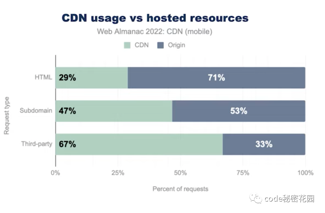 开发者经常使用 CDN 来托管静态资源,如 CSS、JavaScript 或 Media 文件,但是通过 CDN 提供 HTML 也可以获得更多的好处。根据 Web Almanac 的统计结果,只有 29% 的 HTML 文档请求会通过 CDN 服务加载。如果你不是这样做的,那么这意味着你还有很大的机会来优化网站的性能。