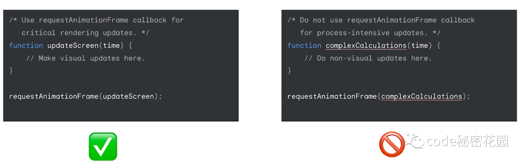最后,大家应该避免滥用 requestAnimationFrame API,它应应该只用于关键的渲染工作,如果通过这个 API 安排了过多的工作,它会导致渲染变慢。