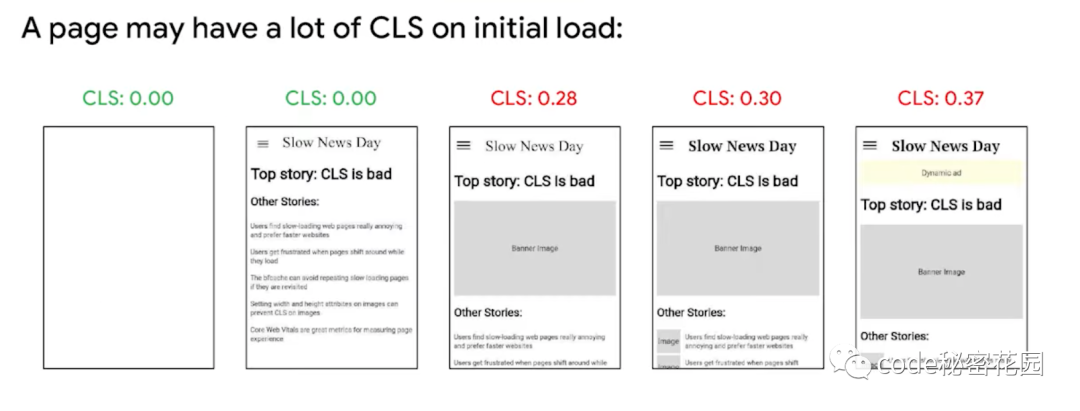 下面,我们来看看累积布局移位(CLS)的优化建议。CLS 是网页视觉稳定性的度量指标,意味着当有新的内容加载时,页面的内容是否经常跳动。
