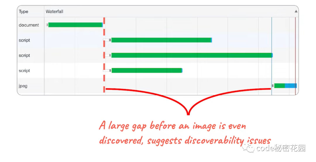你还可以使用 Chrome devtools 中的加载瀑布工具来识别开始加载较晚的资源,通过把图片包含在 HTML 中(让图片元素预加载)即可解决这个问题。但是在将 LCP 图像优化的可以被易于发现后,并不代表就可以更快的加载。因为浏览器更倾向于优先处理阻塞渲染的内容,如 CSS 和同步 JavaScript,而不是图像。