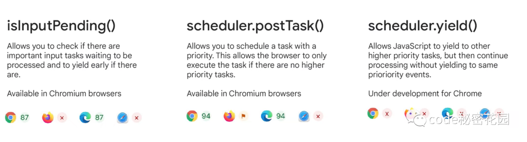 还有一些新的和即将推出的浏览器 API ,如 isInputPending、scheduler.postTask 和 scheduler.yield,它们可以帮助大家决定何时以及如何放弃主线程。有关更多详细的信息,可以去看 web.dev 上优化长任务的相关文章 :https://web.dev/optimize-long-tasks/ 。另外,在 Google I/O 上,还有一个专门关于优化长任务的独立演讲。