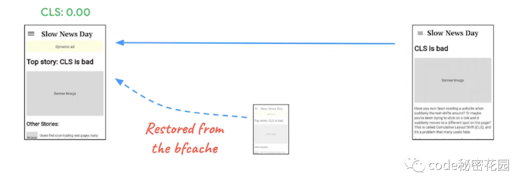 我们去年看到 CLS 的最大改进之一是在 Chrome 中推出的回退缓存或 BF 缓存中。另外,Safari 和 Firefox 也已经上线这个功能一段时间了。