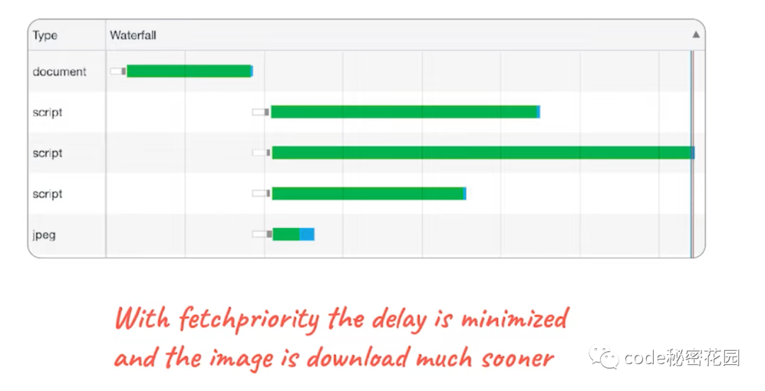 回到之前的例子,我们解决了图片可尽早被发现的问题,但是请求图像和开始下载依然会存在很大的延迟。使用 fetch proirity API 可以将延迟最小化,并且让图像尽快下载。