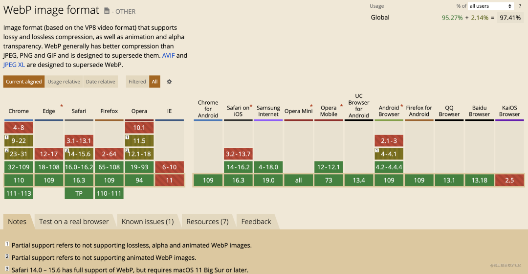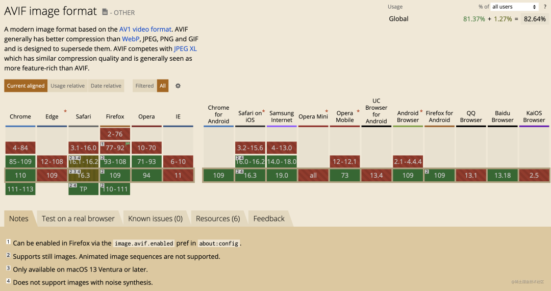 最后,再看看兼容性,目前(2023-02-05)它的兼容性介于 WebP 与 JPEG XL 之间