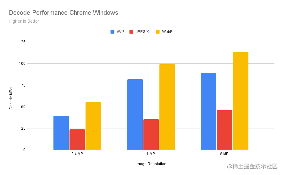 可以看到,对于解码性能的对比,JPEG XL > AVIF > WebP。