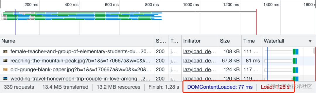 我这里没有模拟弱网环境,网速非常快,可以看到,发送了 339 个图片资源请求,也就是全部的图片资源在页面加载的过程中都请求了,页面 Load 事件完成的时间为 1.28s。