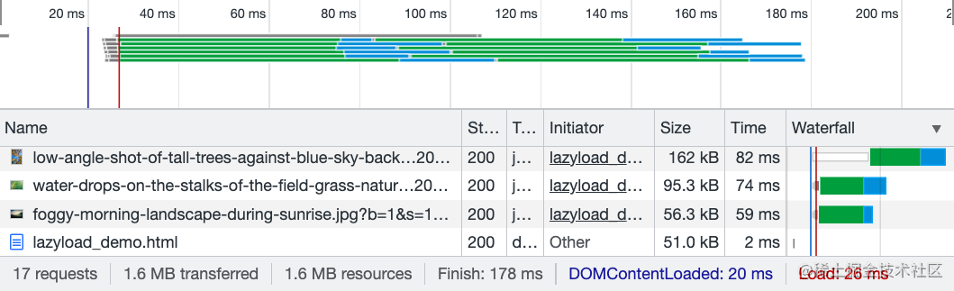 可以看到,这一次只发送了 17 个图片资源请求,页面 Load 事件完成的时间为 26ms。