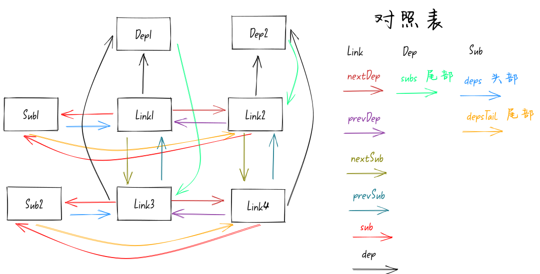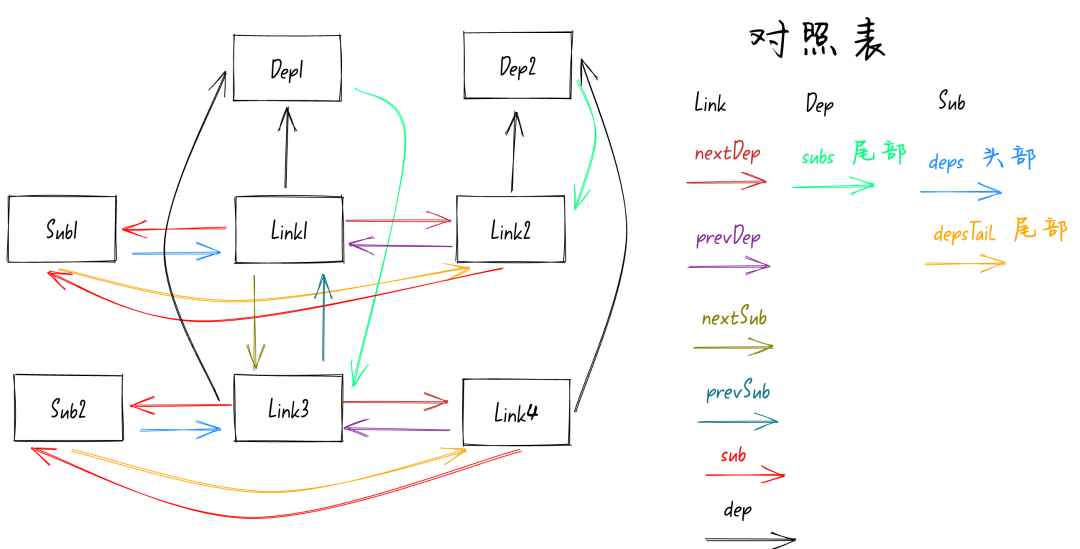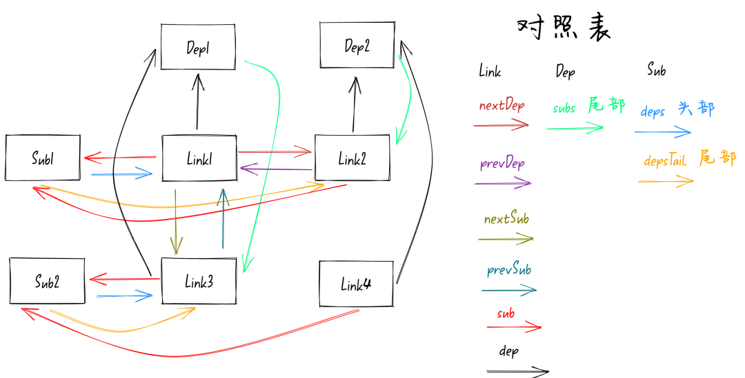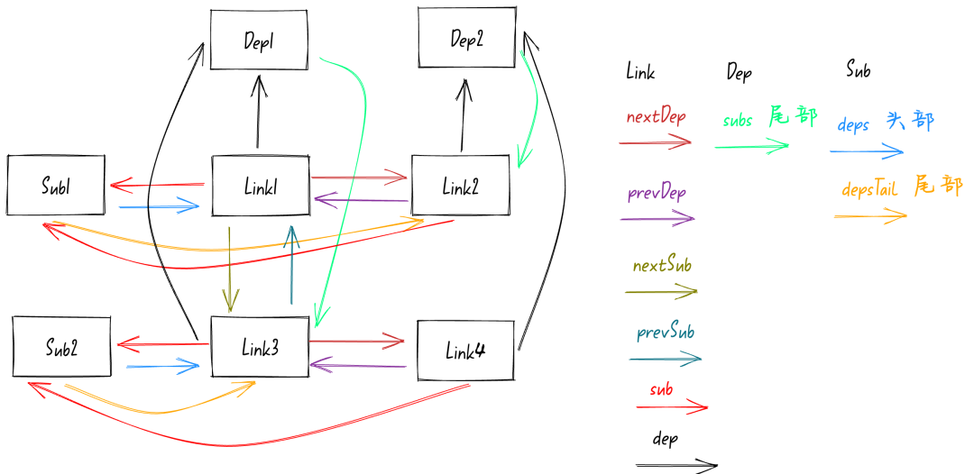 class Link { // 指向Subscriber订阅者 sub: Subscriber // 指向Dep依赖 dep: Dep // 指向Link链表的后一个节点(X轴) nextDep: Link // 指向Link链表的前一个节点(X轴) prevDep: Link // 指向Link链表的下一个节点(Y轴) nextSub: Link // 指向Link链表的上一个节点(Y轴) prevSub: Link}前面我们讲过了新的响应式模型中Dep依赖和Sub订阅者之间不会再有直接的关联,而是通过 Link 作为桥梁。